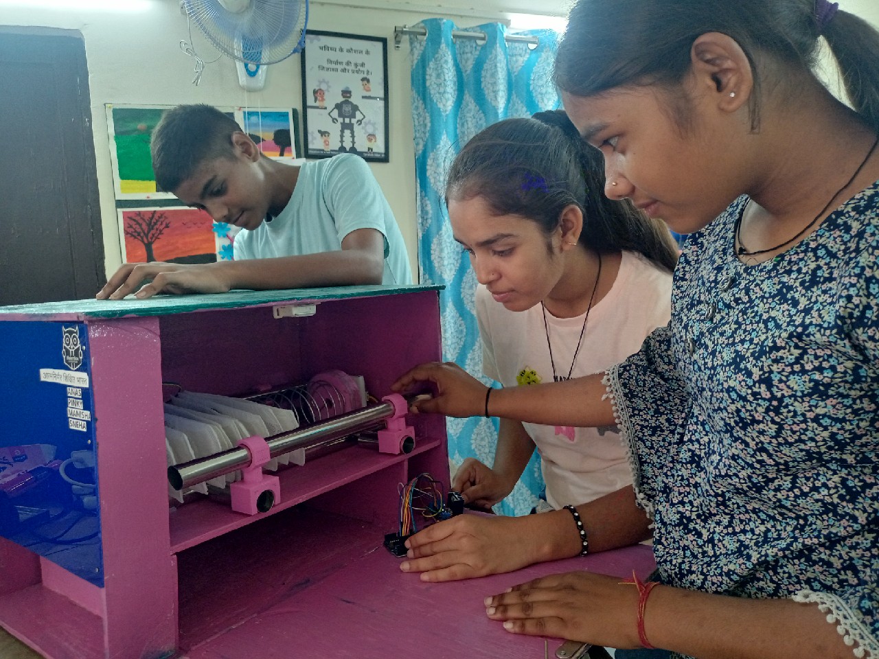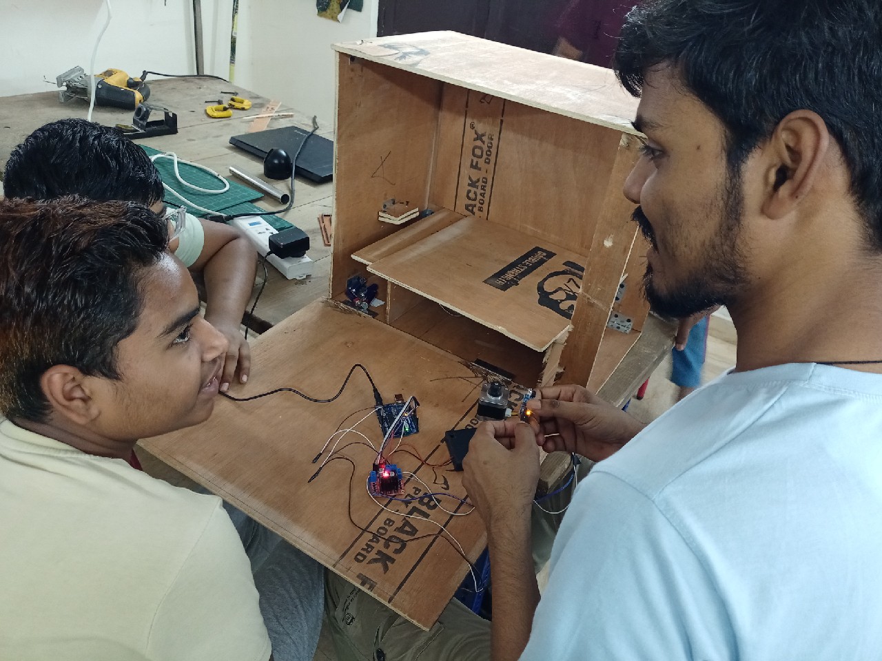 Students actively developing a password-based sanitary dispenser machine, ensuring secure access and promoting hygiene with innovative technology in action.