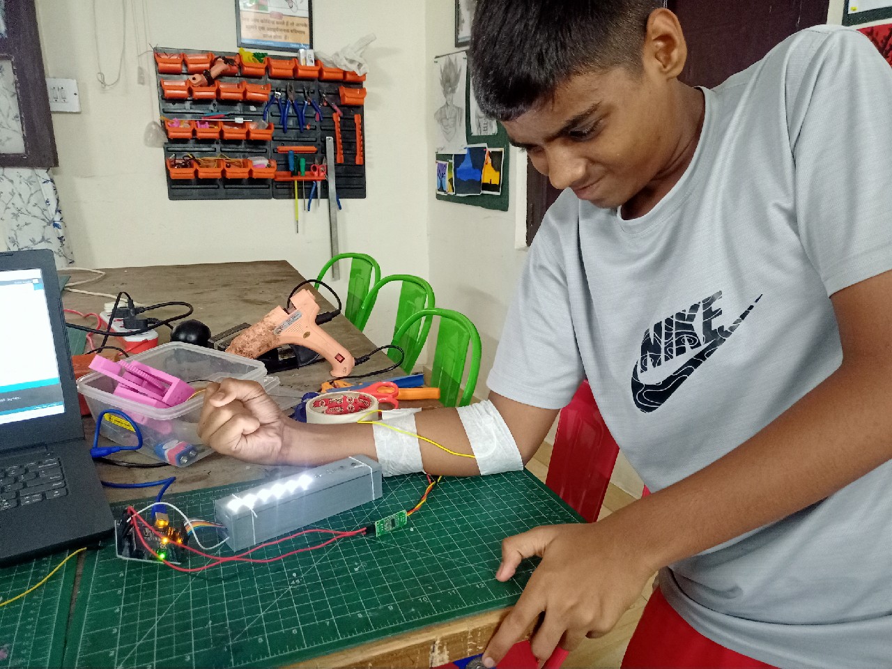 Students build a kit with LED's and an electromyography (EMG) sensor to measure muscle strength.